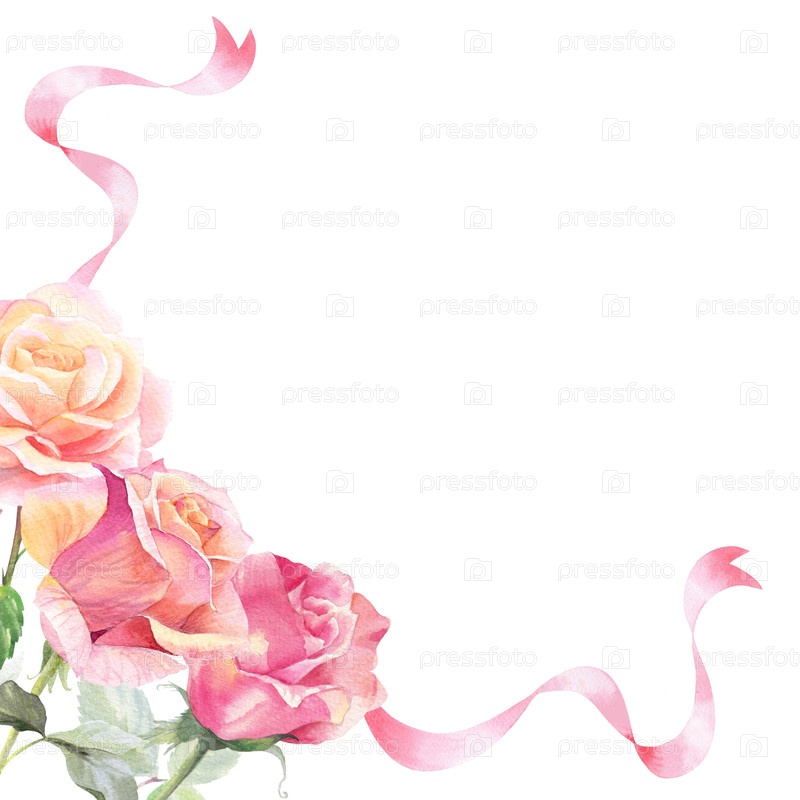 Угловая рама из роз и шелковой ленты. Ирисы акварели, розы, луки, шелковая лента и соломенная корзина. Для дизайна упаковки, карт, обложки, принтов, этикеток на продуктах и тканей