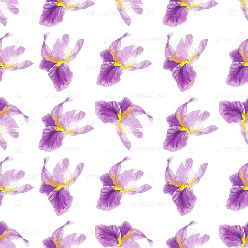Бесшовный рисунок ирисов. Иллюстрация акварельных красок ручной работы. Для дизайна упаковки, карт, обложек, принтов, этикеток на продуктах и тканей
