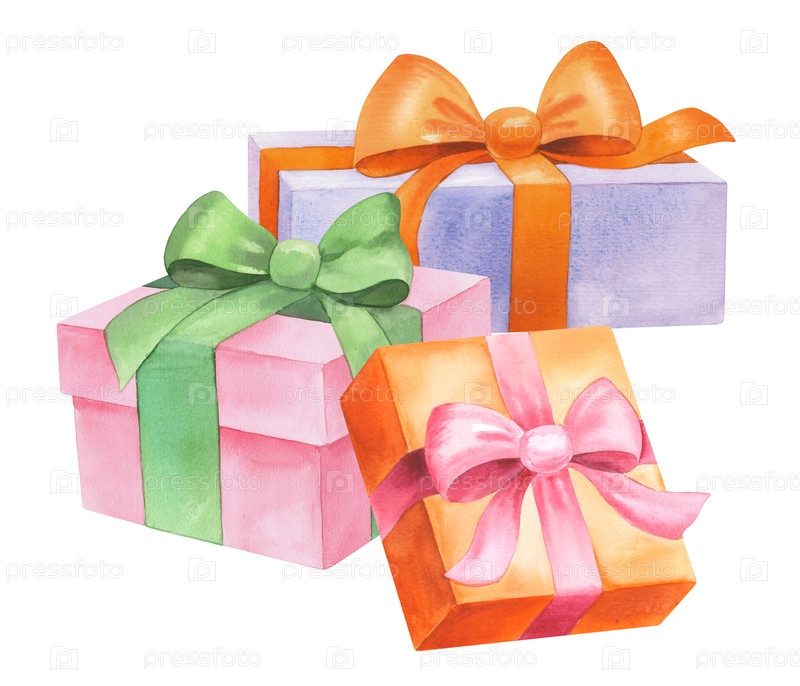 Акварельные подарочные коробки с шелковыми лентами. Иллюстрация акварели. Для ткани, обоев, упаковочной бумаги, поздравительных открыток, дизайна, декора и иллюстрации