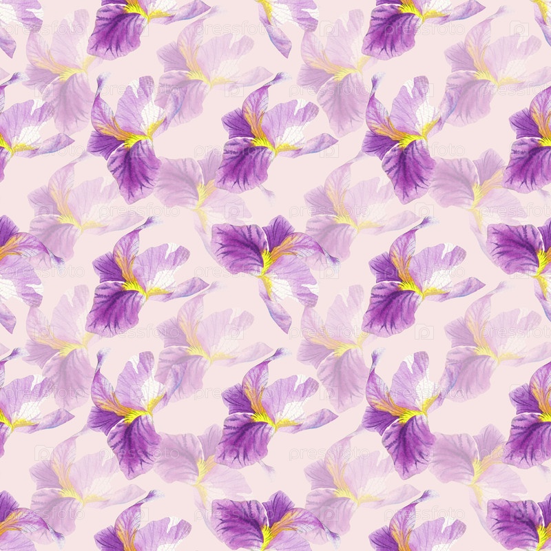 Бесшовный рисунок ирисов. Иллюстрация акварельных красок ручной работы. Для дизайна упаковки, карт, обложек, принтов, этикеток на продуктах и тканей