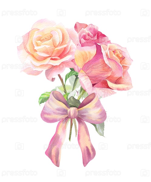 Букет роз и шелковой ленты. Ирисы акварели, розы, луки, шелковая лента и соломенная корзина. Для дизайна упаковки, карт, обложки, принтов, этикеток на продуктах и тканей