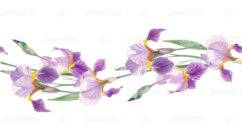 Бесшовная граница фиолетового цвета с желтыми ирисами. Иллюстрация акварельных красок ручной работы. Для дизайна упаковки, карт, обложек, печатных изображений, этикеток продуктов и тканей