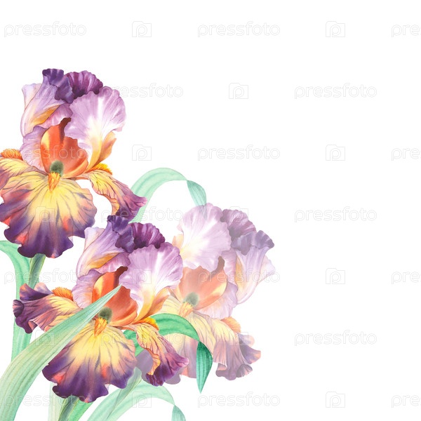 Угловая рама фиолетового цвета с желтыми ирисами. Иллюстрация акварельных красок ручной работы. Для дизайна упаковки, карт, обложек, принтов, этикеток на продуктах и тканей