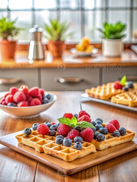 Деревянный стол, покрытый свежими фруктовыми вафлями