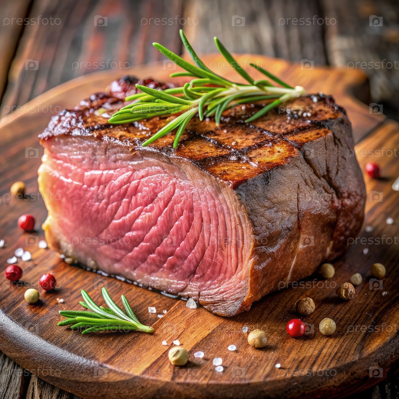 Сочный средний жареный стейк на деревянной плите