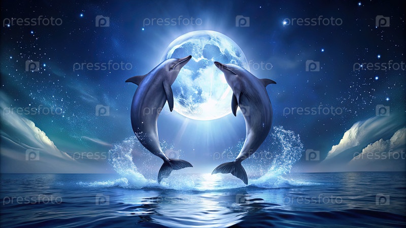 Два дельфина прыгают перед полнолунием, генерируя ИИ