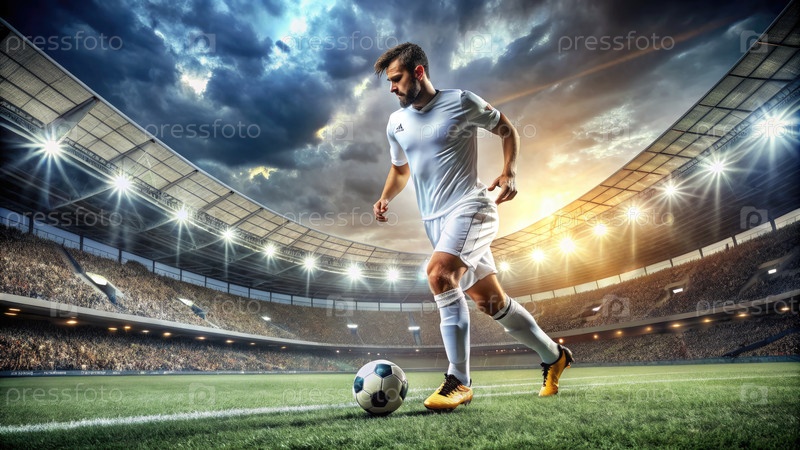 Мужчина в белой рубашке бьет футбольный мяч