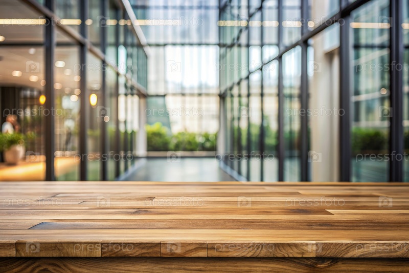 Деревянный стол перед стеклянным зданием, генерирующий ИИ
