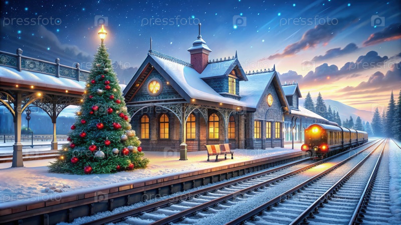 Железнодорожная станция с рождественской елкой, генерирующая ИИ