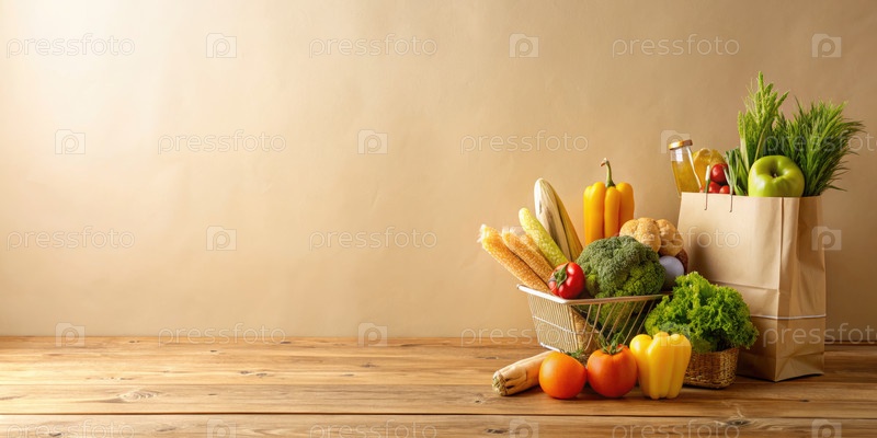 Деревянный стол с бумажным пакетом из фруктов и овощей