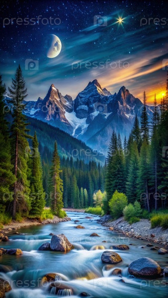Горная река течет под ночным небом