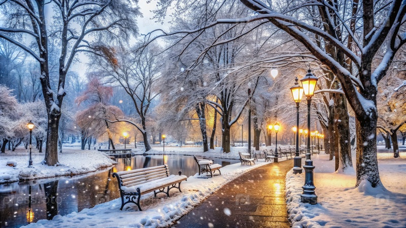 Снежный парк с скамейками и огнями, генерирующий ИИ