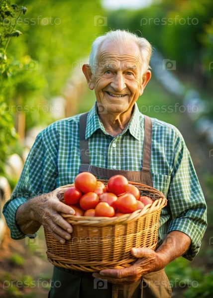 Мужчина держит корзину помидоров в саду