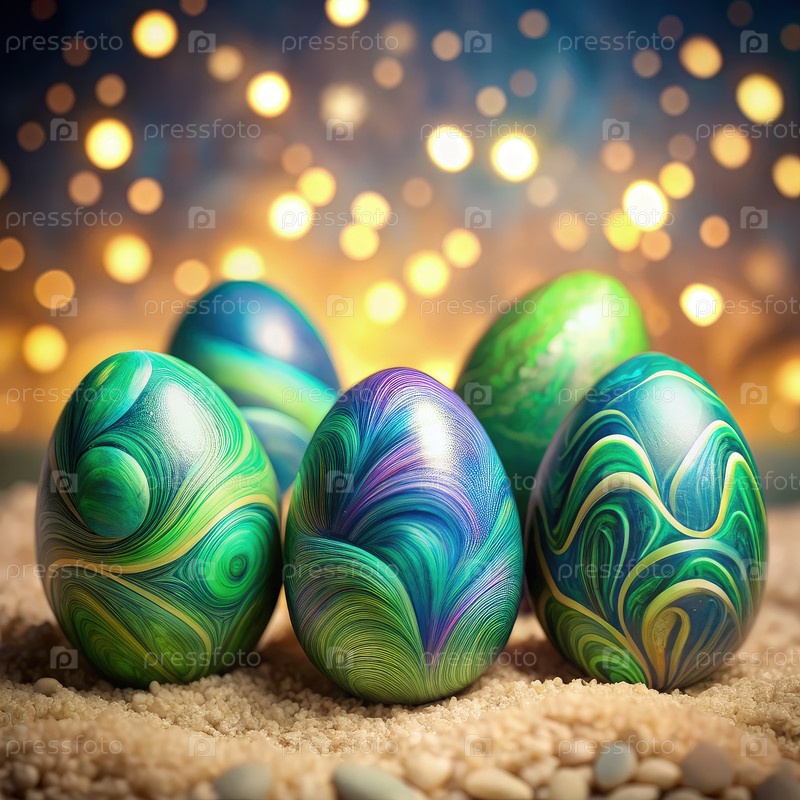 Три красочных окрашенных яйца, лежащие на песчаной почве генерируют ИИ
