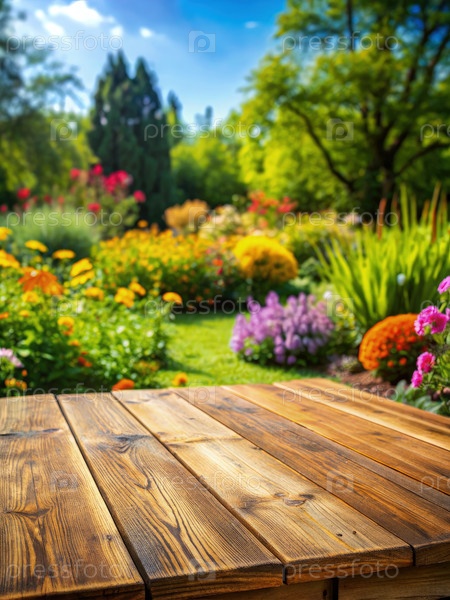 Деревянный стол в саду с цветами
