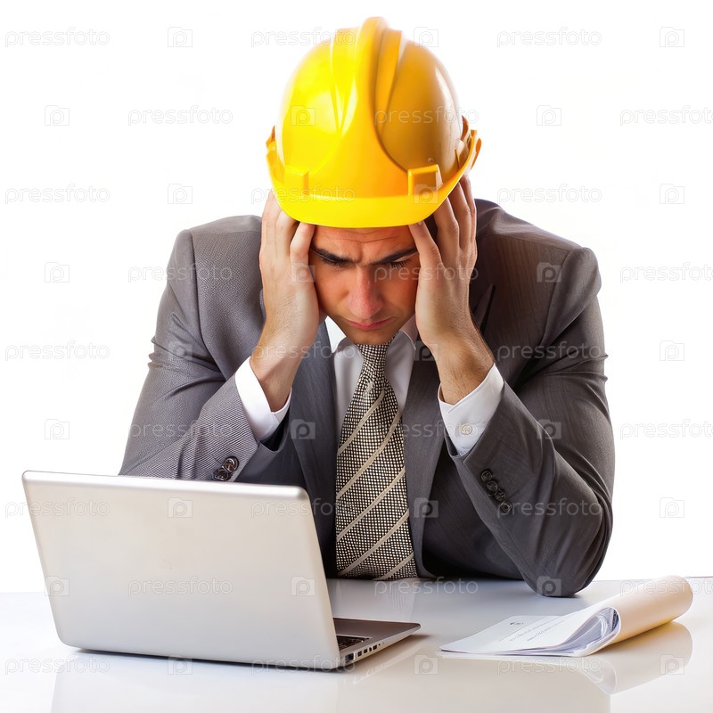 Человек в костюме и желтой шляпе с ноутбуком на столе