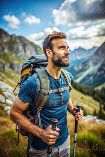 Человек, путешествующий с рюкзаком и поляками в горах