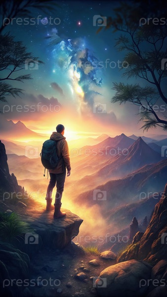 Человек стоит на горе и смотрит в небо, генерируя ИИ