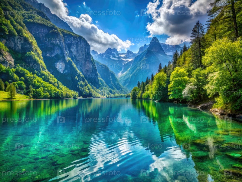 Спокойное озеро окружено зелеными деревьями и горами
