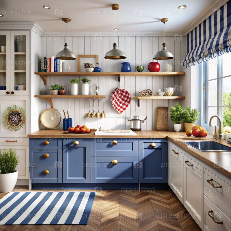 Голубые шкафы и деревянные полы на кухне