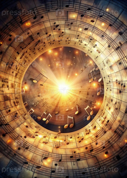 Излучающийся круг листовой музыки, освещенный золотым светом в художественной композиции