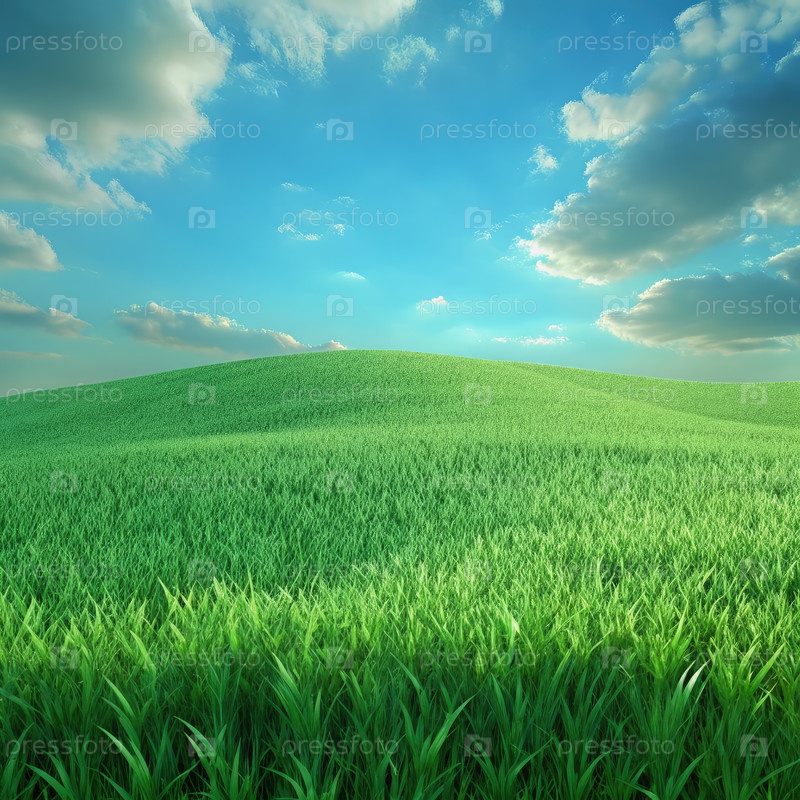 Плодоносное зеленое травяное поле под чистым голубым небом
