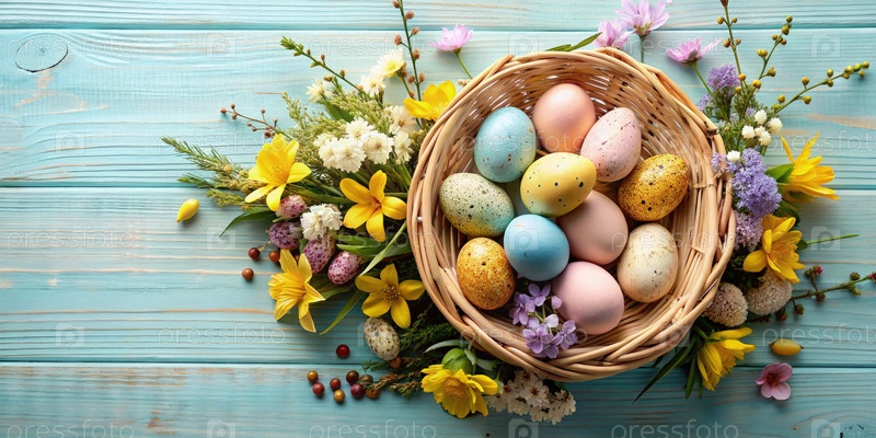 Корзина заполнена красочными яйцами