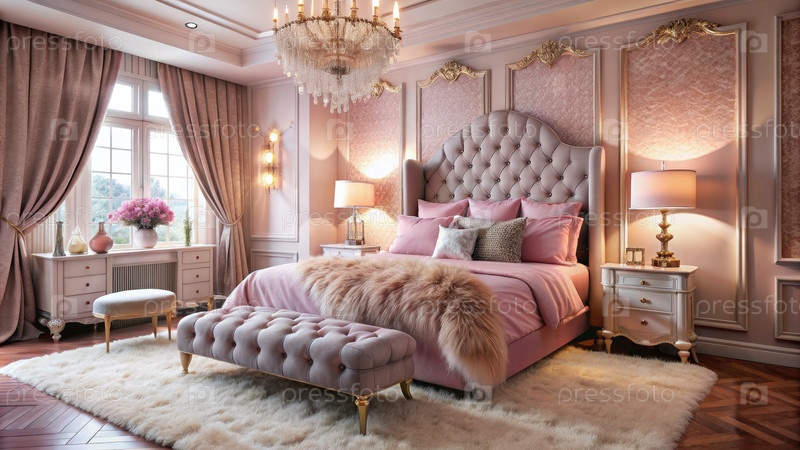 Стильные розовые кровати и люстры в модной спальне