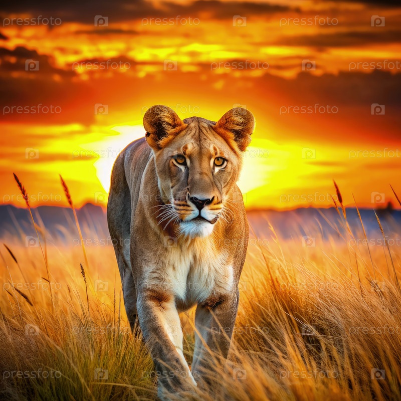 Величественный лев, идущий по высокой траве при закате солнца