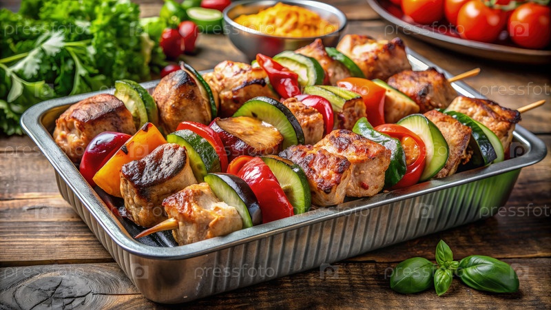 Металлическая сковородка, наполненная классическим шиш-кебабом и жареным овощем