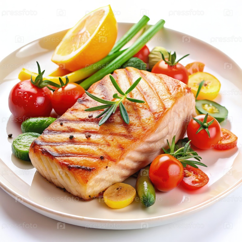 Стрейк из жареного лосося с овощами на белой печи