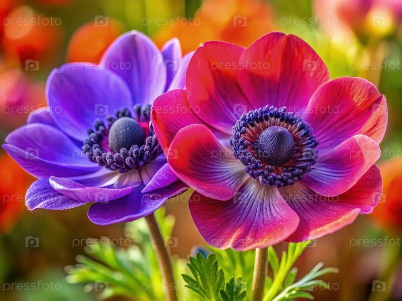 Два фиолетовых и пурпурных цветка анемоны в поле. генерируя AI