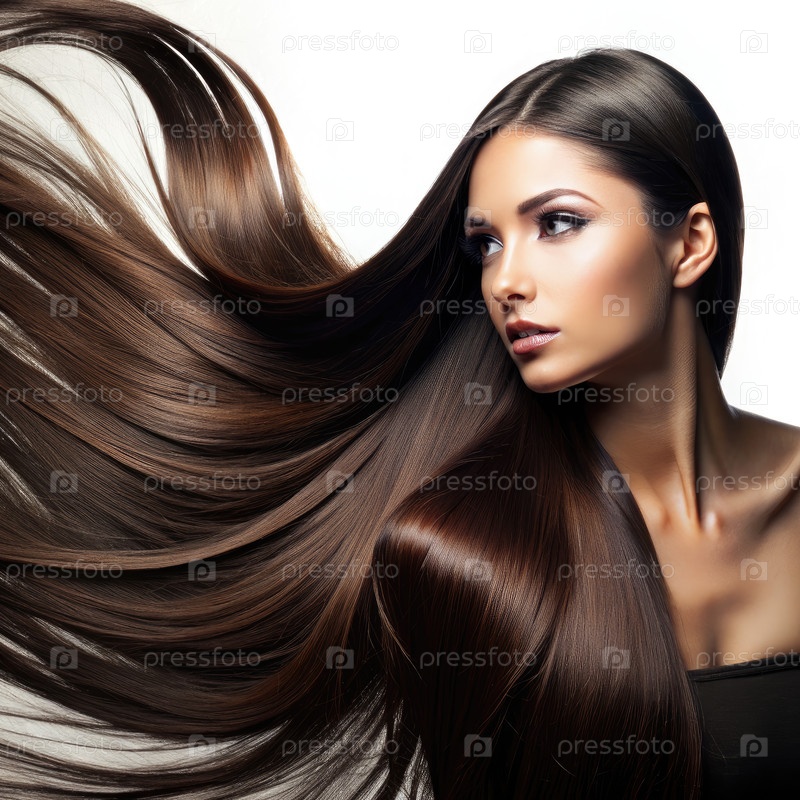 Женщина с длинными коричневыми волосами в черном на белом фоне