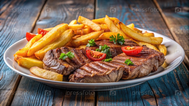 Тарелка с стейком и картофелем на деревянном столе