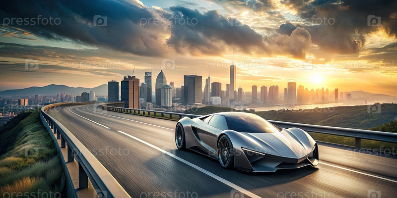 Футуристический автомобиль, едущий по шоссе с городским фоном Генерация ИИ
