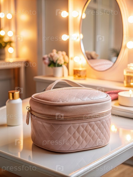 Розовый мешок для макияжа на круглом столе