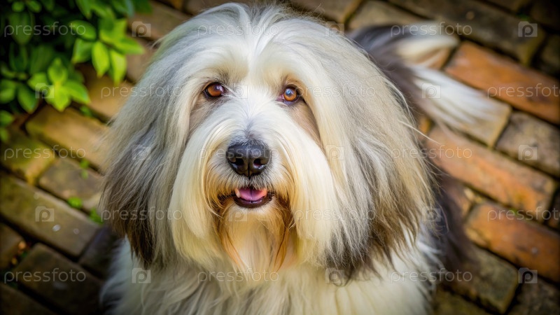 Старая английская овчарка на кирпичной земле