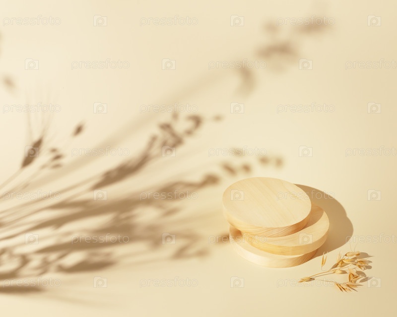 Деревянный вырез подиума на бежевом фоне с тенями растений