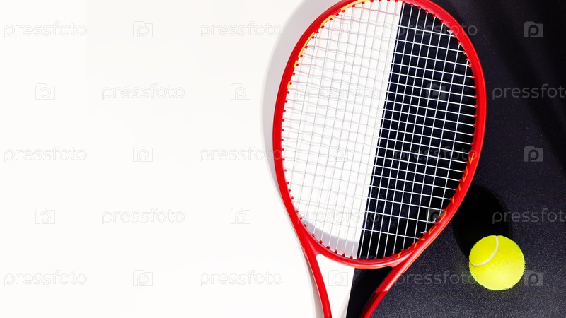 Теннисный баннер. Спортивная композиция с теннисной ракетой и мячом на черно-белом фоне с авторским правом. Спорт и здоровый образ жизни. Концепция активного игрового спорта