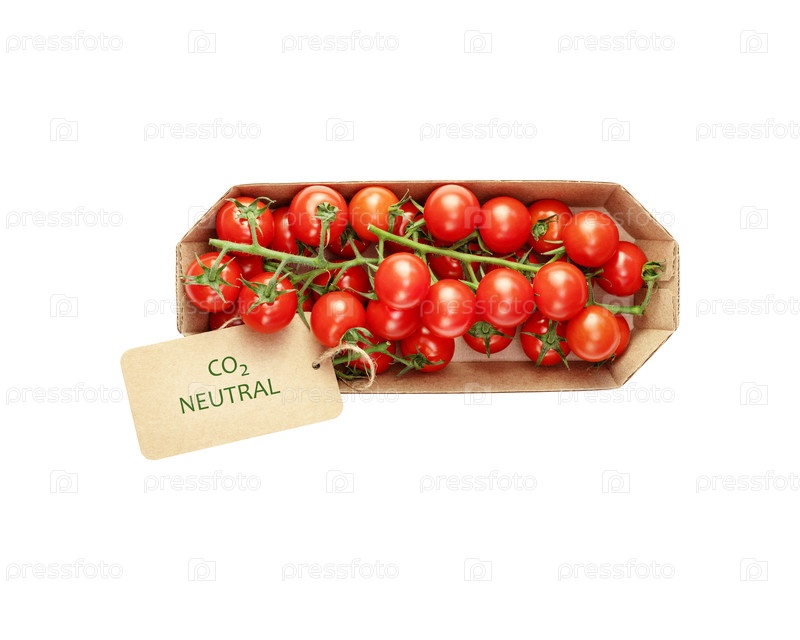 Изолированные органические вишневые помидоры в экологически чистой ремесленной упаковке с маркировкой 'углеродно-нейтральный' на белом фоне. Сезон местных овощей с маркировкой углерода. Плоский мир