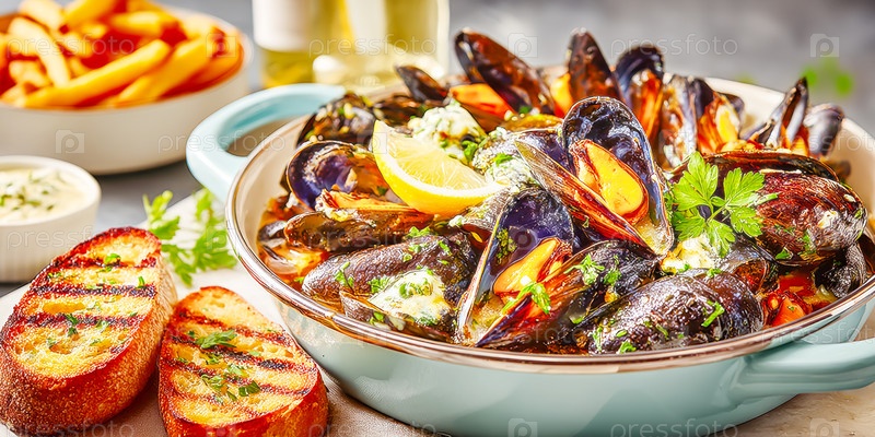 Свежеприготовленные мидии подаются вместе с жареным хлебом, лимоном и травами в уютном ресторане.Гурманская концепция морепродуктов, средиземноморская кухня и кулинарное вдохновение для визуальных изображений пищи