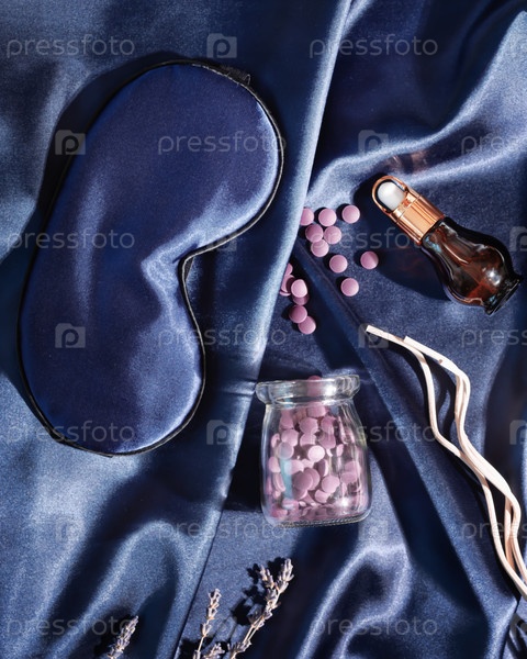 Выборочный фокус терапевтической композиции с помощью маски для сна, снотворного, растительного масла и цветов лаванды на синем шелковом постельном белье. Бессонница или депрессия при бессонных ночах. Уход за сном