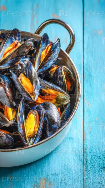 Паровые мидии в металлической сковороде на синем деревенском столе