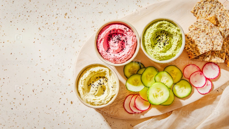 Красочное трио гумуса со свежими овощами и крекерами на ярком столе с копируемым пространством