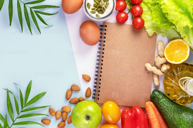 Концепция здорового питания с фруктами, овощами, оливковым маслом и орехами