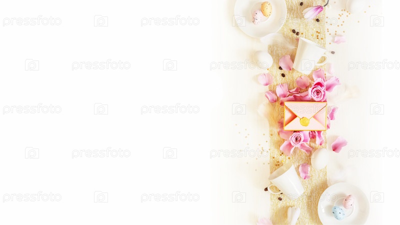 Пасхальный праздничный баннер с чашками для кофе, яйцами и подарочной коробкой