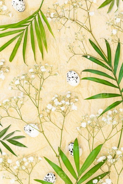 Весенняя цветовая композиция с пальмовыми листьями, яйцами и белыми гипсофилами на складчатой бумаге