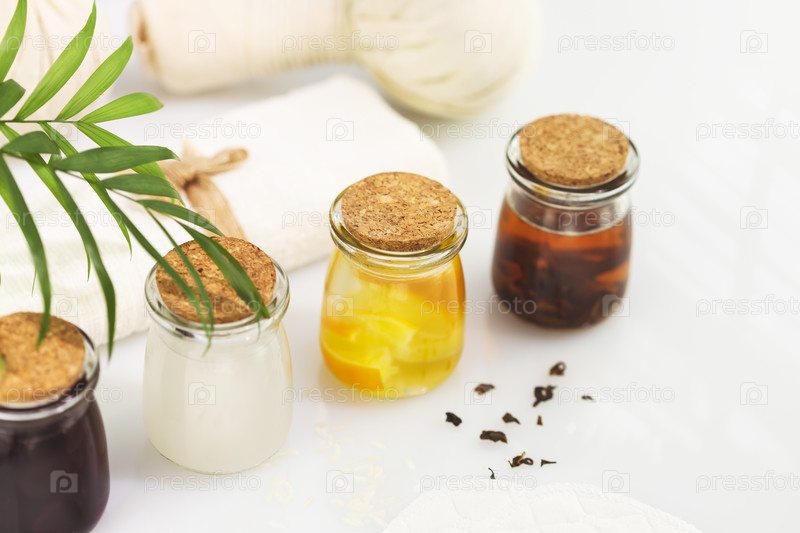 Ферментированные средства по уходу за красотой.Уэлнес-композиция с ручкой из рисовой воды, зеленой чайной воды, лимонной воды и косметических аксессуаров на белом столе.Натуральная домашняя косметика на основе ферментированных продуктов