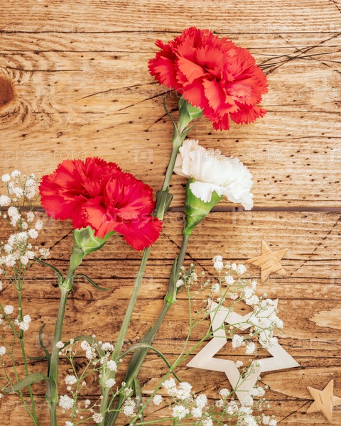 Красно-белые гвозди и декоративные звезды на деревянном фоне