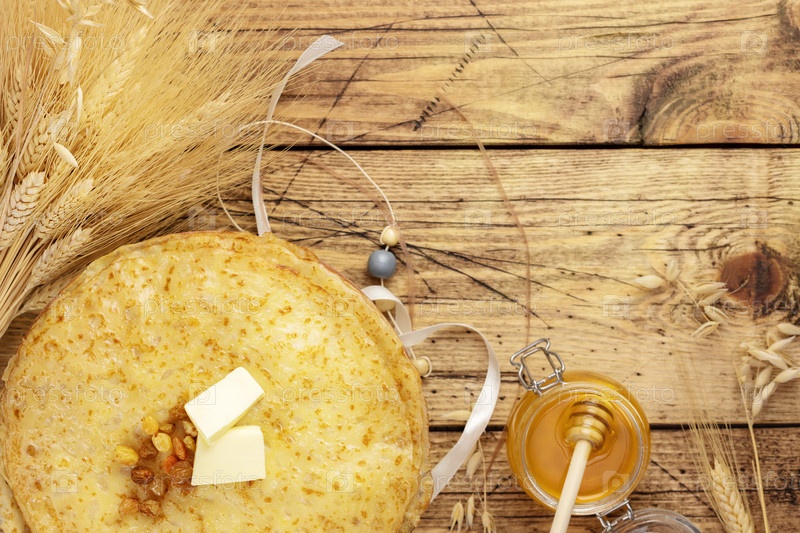 Жареные блины, консервы с медом, пшеничный сноп и ржи